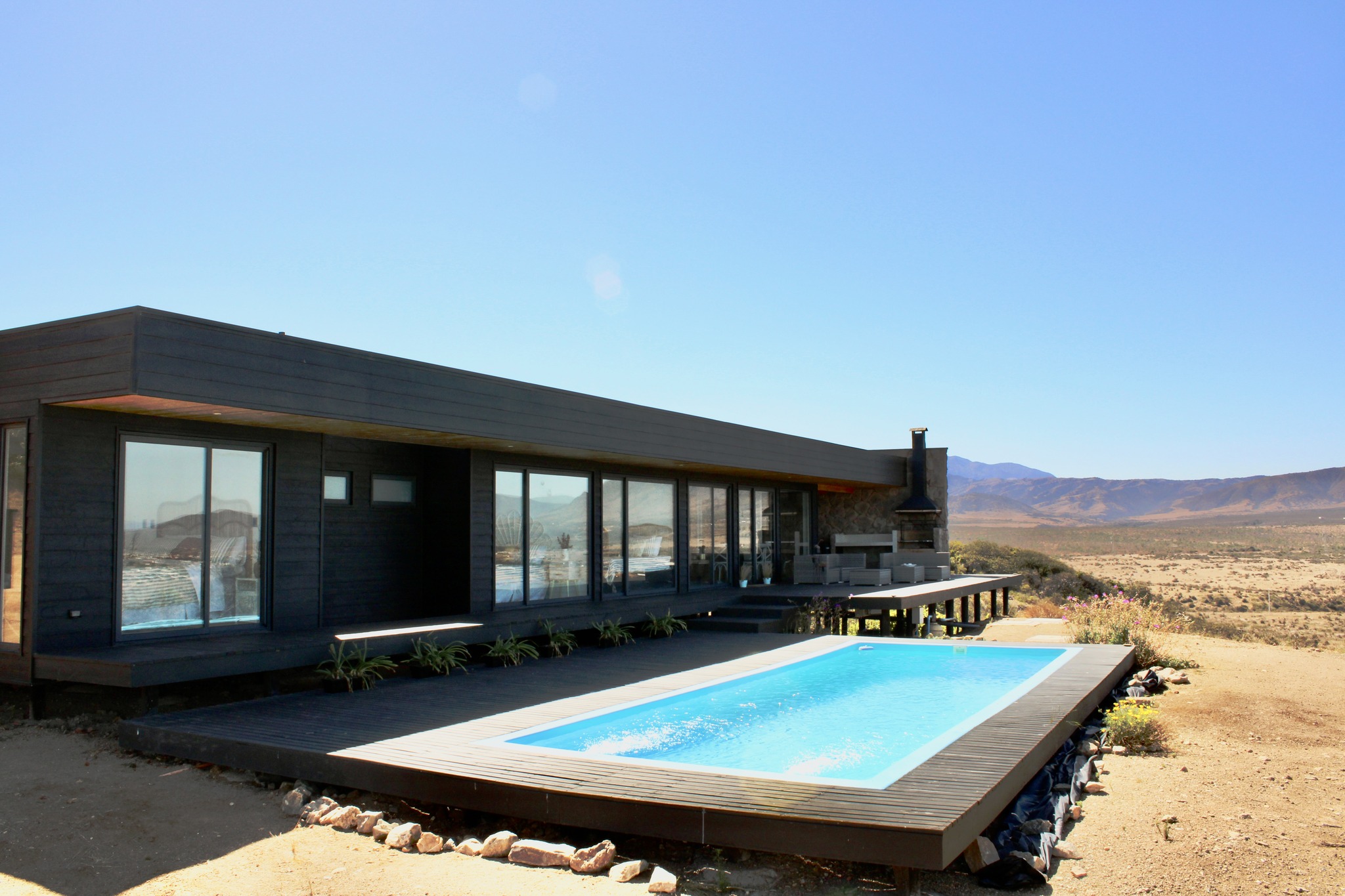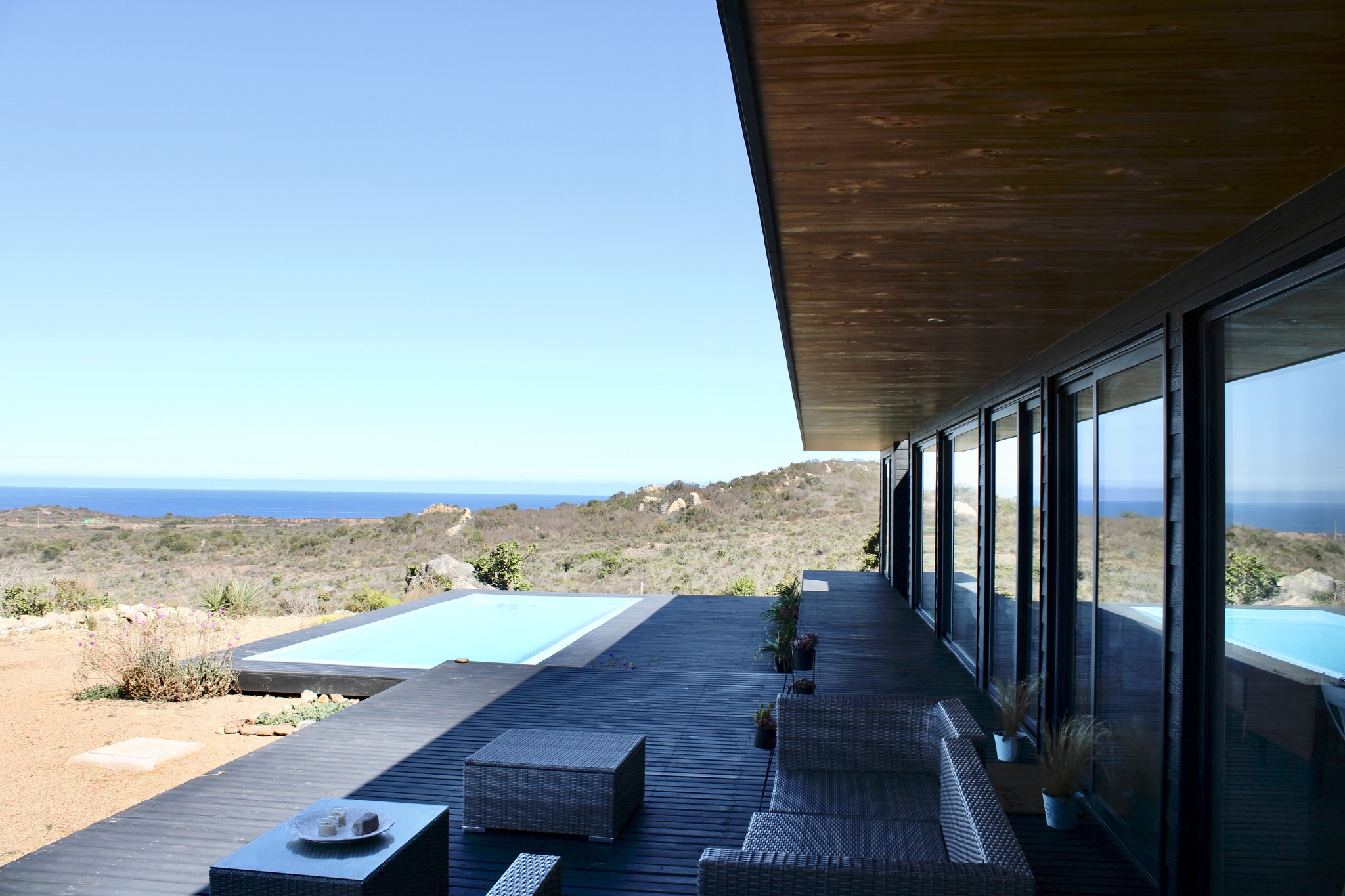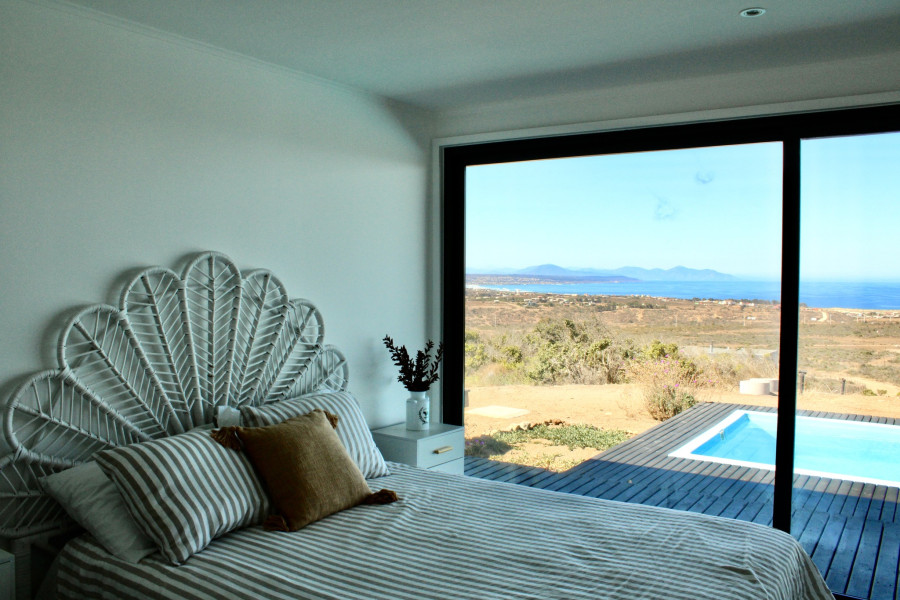 Moderna casa Mediterránea con hermosa vista al mar ubicada en el exclusivo condominio Rocas del Mar, 5km al norte del balneario Los Molles. Se vende amoblada.