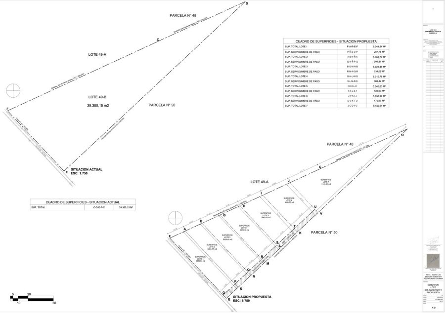 El predio se compone de 7 parcelas rurales con superficies entre 5.000 m² y 9.000 m², todas con acciones de agua inscritas, distribuidas mediante un canal que atraviesa el terreno.
